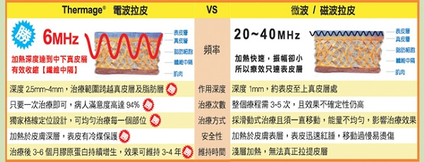 為何電波拉皮的能量要選擇六百萬赫茲(6MHz)?而不選擇更長的電波呢?所謂電波是利用電子每秒進入人體來回震盪反彈的速度測得的,而六百萬赫茲的電波是第一個經美國FDA核准使用於醫學用途的電波頻率,故能穿透更底層的皮膚組織,達到讓肌膚緊緻拉提的效果。由左列電波穿透人體圖可以看出,6MHz電波深度是40MHz的七倍,因此能量傳達深度之優劣立即顯現。經過圖示解說,讓您一窺「電波頻率」與「能量傳達深度」真相。