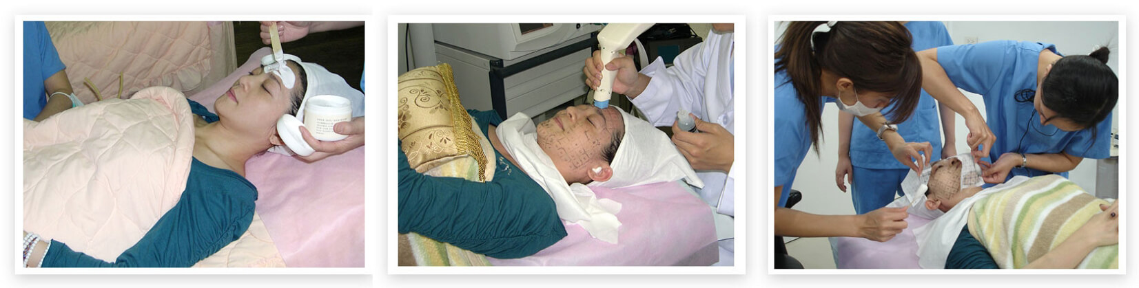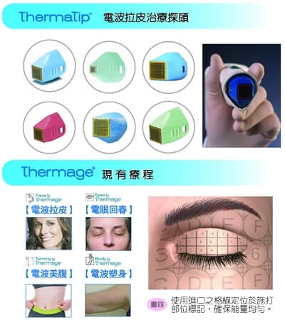電波拉皮獨家專利的格線標記,在進行電波拉皮療程前,專業醫師都會使用進口耗材在施作部位做標記,確保每一吋肌膚受熱均勻,且每一定格施打的部位將會釋放出頻率6MHz治療電波,並且在皮膚的「深層」形成一個均勻的電場,而導致皮膚組織本身的阻抗因磨擦產生熱能。膠原蛋白受熱後使組織收縮,就可以達到3D立體式的收縮效果,不僅可立即感受到皮膚緊緻感,且持續性地產生提拉塑形,平均在三到六個月內達到最佳治療效果。(圖四)