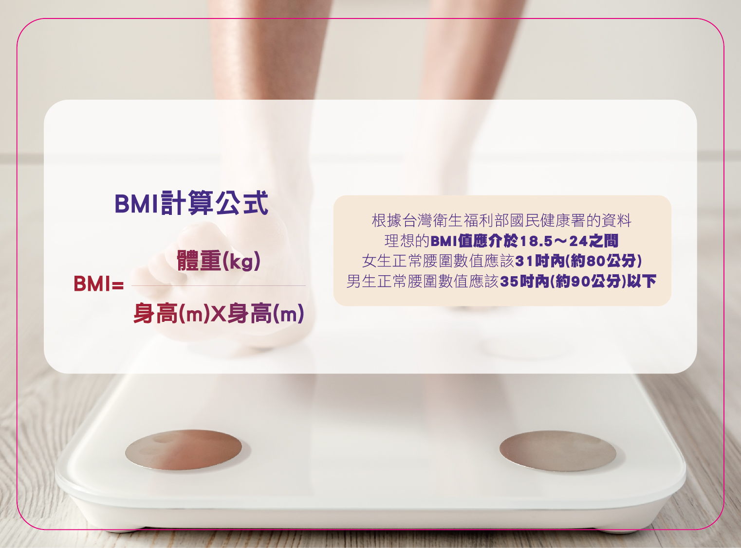 BMI的計算公式,是透過身高來計算出理想的體重區間, BMI的計算公式:=體重(公斤)÷身高(公尺)÷身高(公尺),根據台灣衛生福利部國民健康署的資料,理想的BMI值應介於18.5~24之間。如果身體質量指數若大於27,就應該注意肥胖與健康問題。
