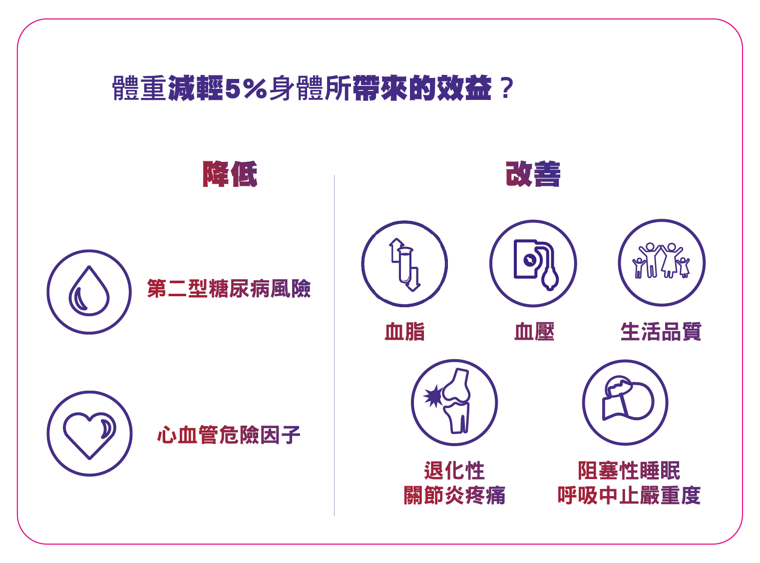 肥胖是引起慢性病的成因之一,長期之下會影響體內器官的正常運作並帶來許多併發症,而世界衛生組織指出「肥胖是一種慢性疾病」,體重越重的肥胖者發生糖尿病、代謝症候群、血脂異常的風險增至一般體重的3倍,當肥胖者的體重減少5%以上將可以改善高血壓、糖尿病與肥胖相關的疾病。