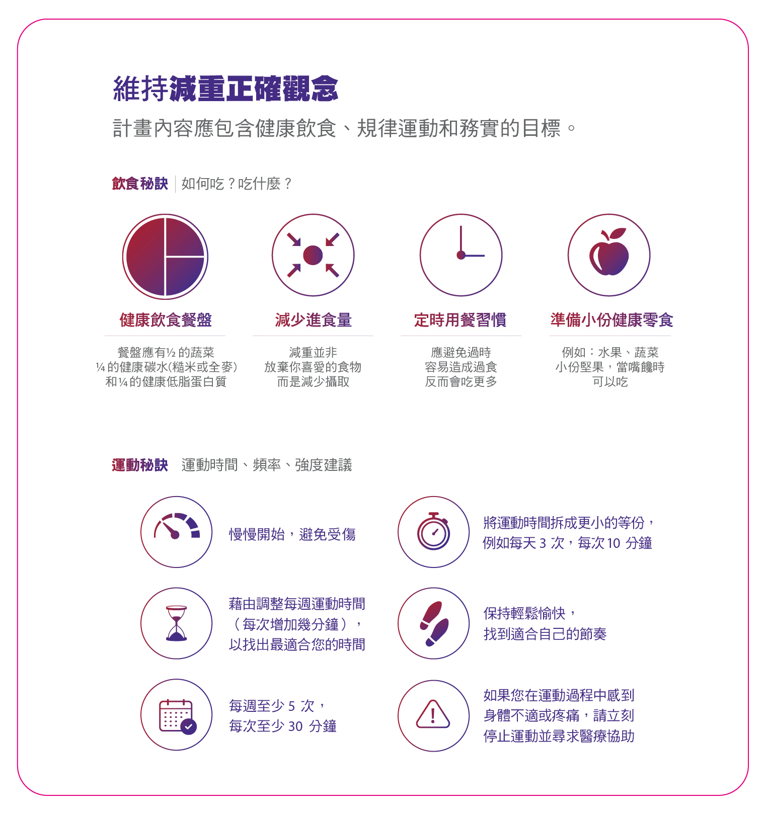 體重管理沒有「速成解決方案」,控制體重是終生的事情。制訂合適自身條件的減重計畫,包含健康飲食、規律運動、和務實的目標。運動秘訣:運動時間、頻率、強度建議,規律運動有助於減重,可進一步預防健康問題,選擇有趣、多變且適合的運動,維持減重的動力。