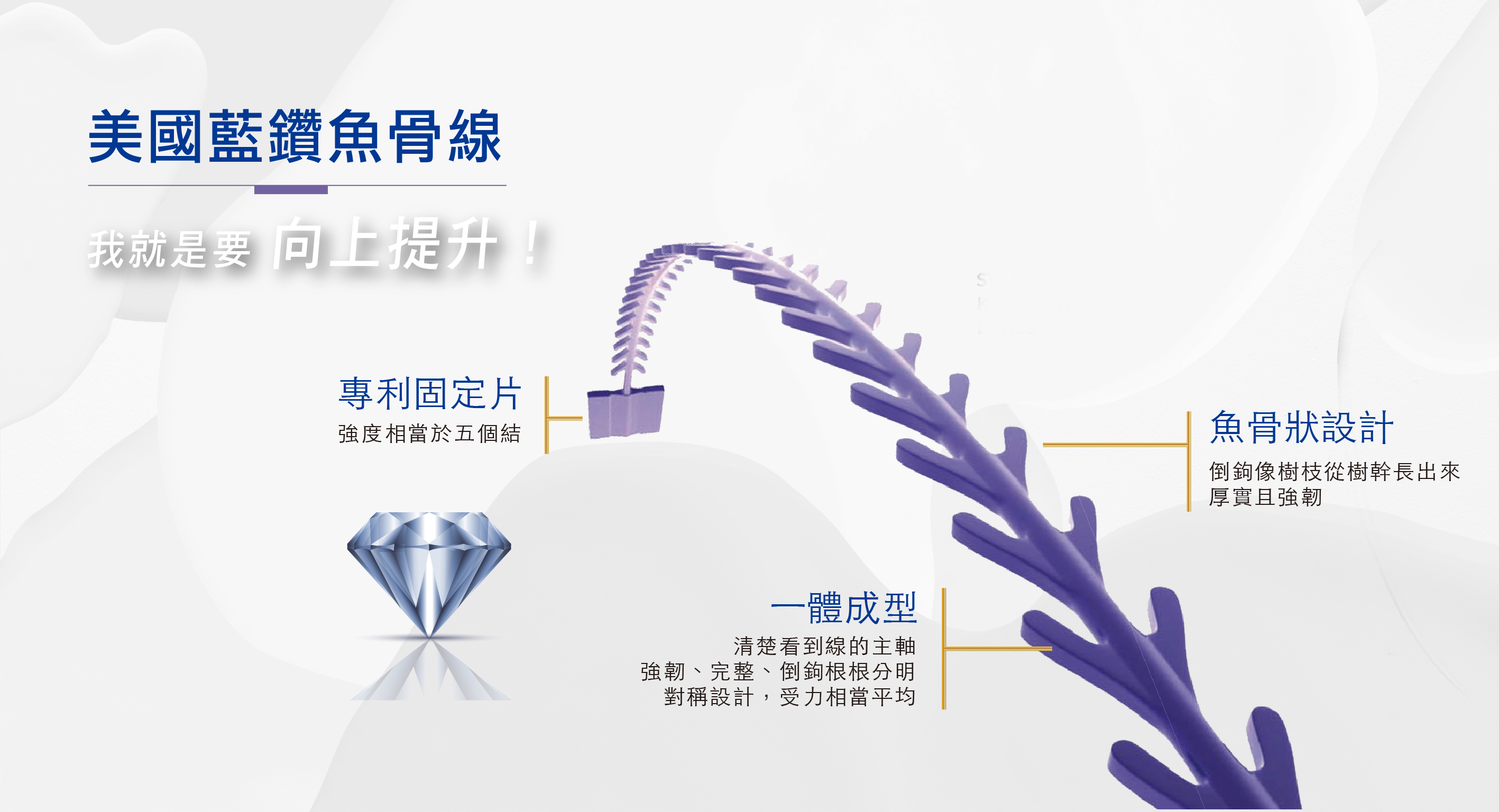 ”愛惜康”思達飛抗菌對稱型免打結傷口縫合裝置(俗稱藍鑽魚骨線),由全球前三大醫療集團-嬌生集團(Johnson & Johnson)研發製造,藍鑽魚骨線擁有一體成型、鈎鈎分明、拉力持久等三大優勢,讓你放心重拾青春,找回夢幻緊緻。一體成型:將材料以壓模方式成型,線材的主幹和側鈎,密度、強度皆相當,使用時能確保受力均勻、不易斷裂