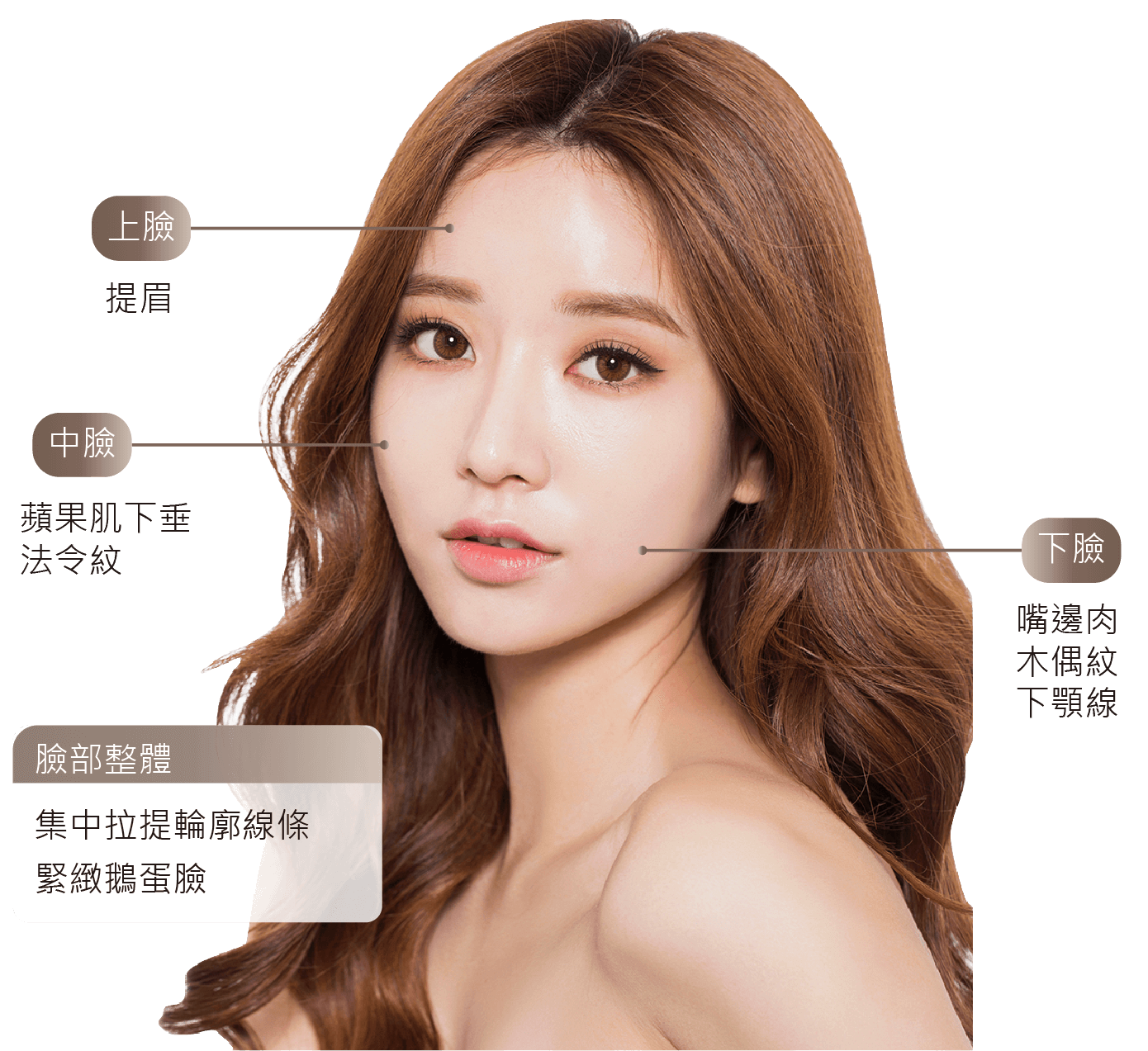 - 下臉:針對臉邊肉下垂、木偶紋、下顎線條不明顯等問題,輕度至中度的臉部下垂、對音波拉皮治療效果不滿意,希望有更積極、明顯的效
