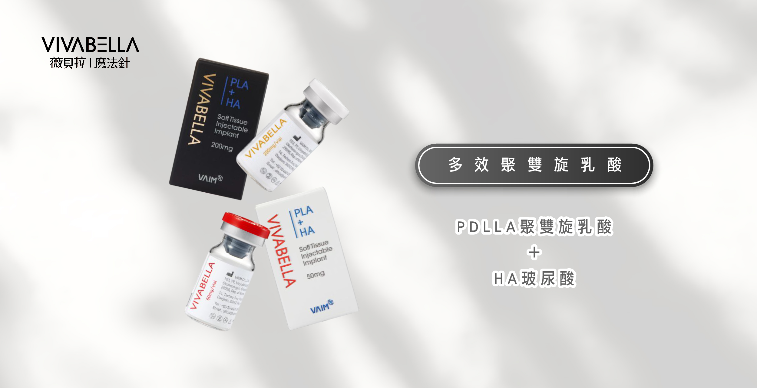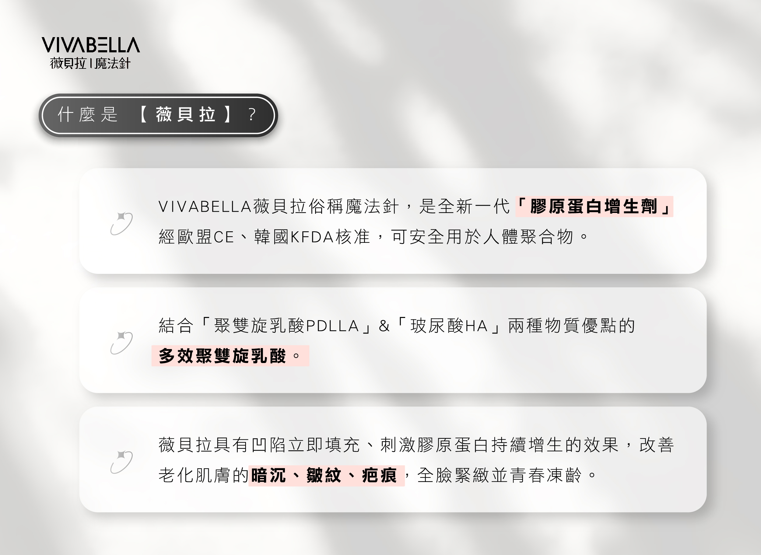 薇貝拉(VIVABELLA),俗稱魔法針、黑/白童針。為風靡韓國多時的新一代膠原蛋白增生劑。結合85%「聚雙旋乳酸PDLLA」與15%非交聯玻尿酸優點混合而成「多效聚雙旋乳酸」。由於施作後不易產生結節、不用按摩、舒適度高,再加上可被人體吸收代謝等特性,因此深受韓國女性喜愛。