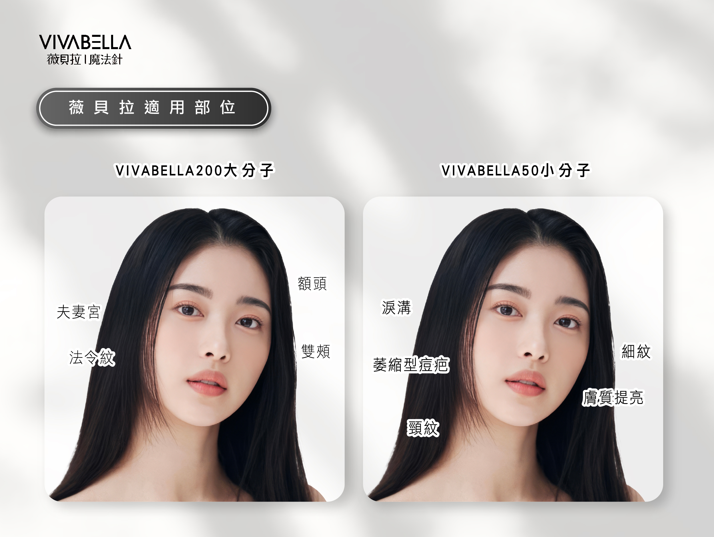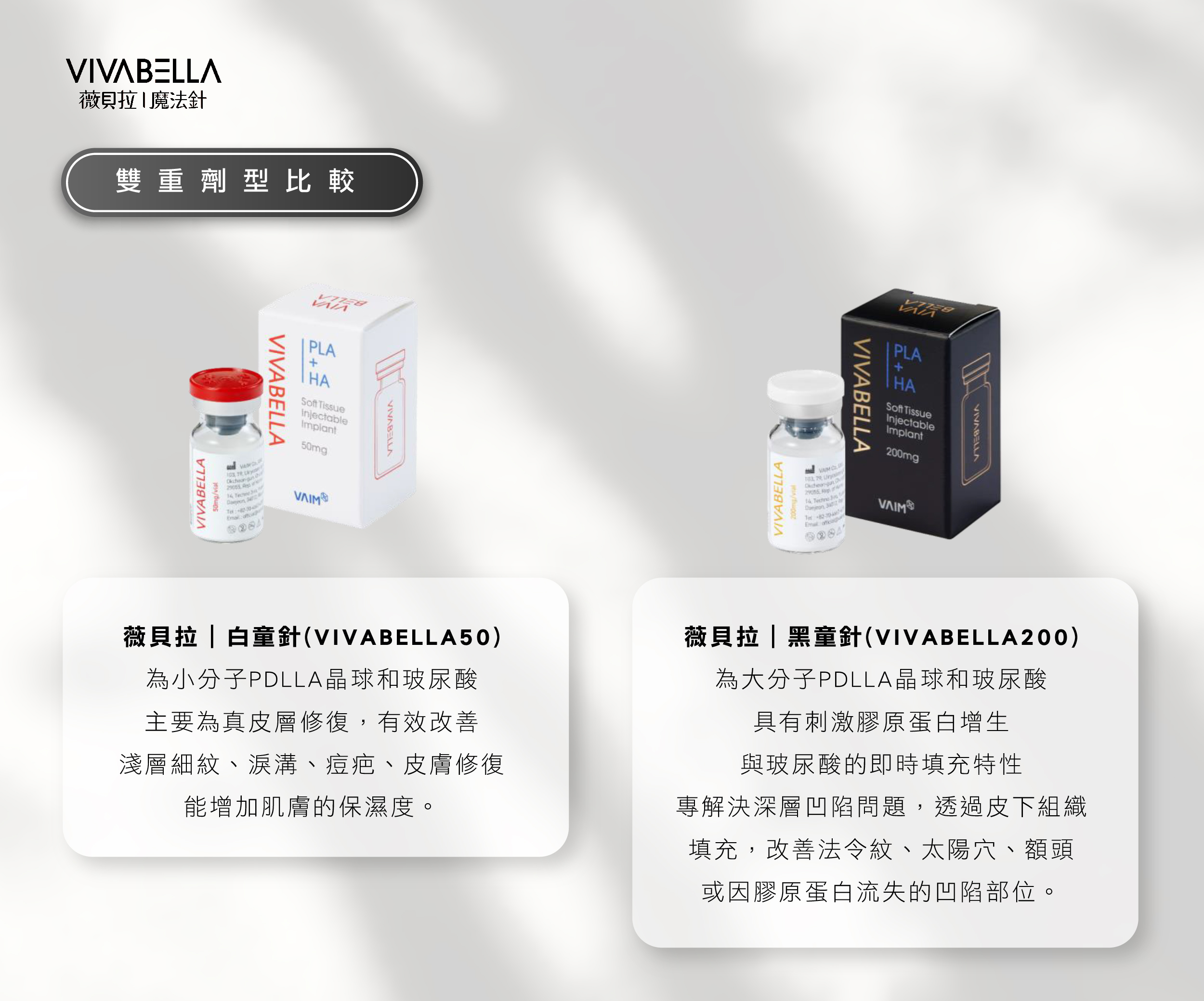 VIVABELLA 薇貝拉劑型分為以下兩種,又暱稱為「黑童針(VIVABELLA 200)」與「白童針(VIVABELLA 50)」,兩者差異在於 PDLLA 微球的顆粒大小。不同分子的 PDLLA 微球體積,可適用施打在不同凹陷部位,也能解決不同老化困擾。