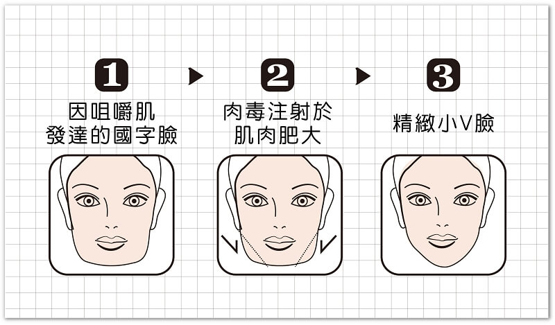 臉上大部份的皺紋是由於臉上表情豐富肌肉過度活躍所造成,肉毒桿菌素可使過度收縮的小肌肉(咀嚼肌、臉部動態肌紋牽動)放鬆,藉以消去因臉部肌肉運動所產生的皺紋,亦達到預防新皺紋產生的效果,用來改善動態法令紋、雙側咀嚼肌肥大的大餅臉效果明顯。