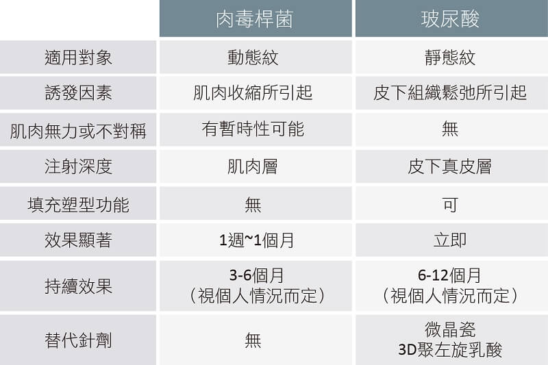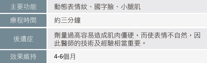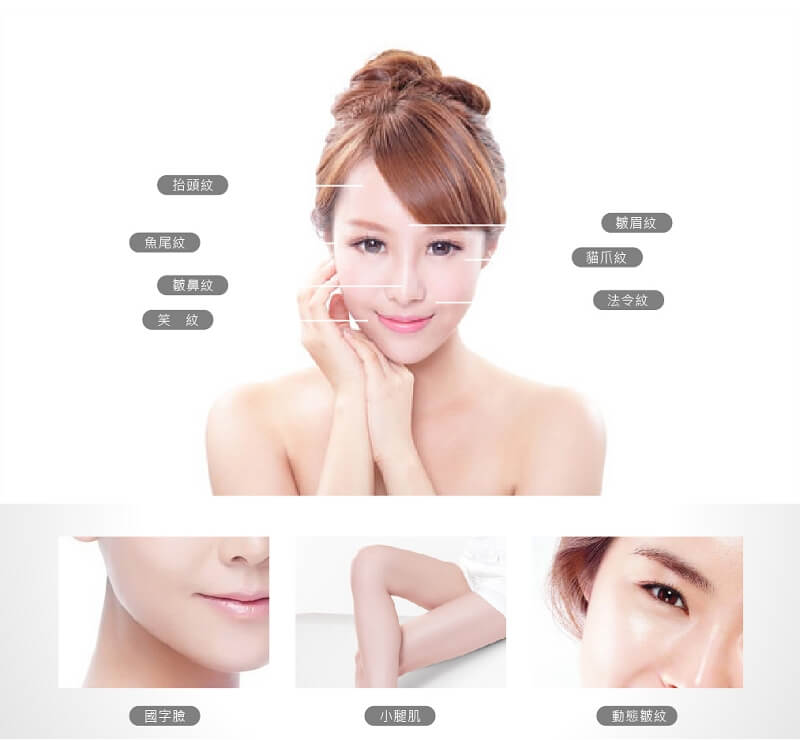 1.肉毒桿菌注射適用於動態性皺紋,即表情肌肉運動所產生的紋路,如:抬頭紋、皺眉紋、魚尾紋、貓爪紋、法令紋。藥效約在一週後後發揮作用,依注射部位有不同的有感反應,肌肉部位明顯者的最佳治療期請以醫師當面評估後為準。