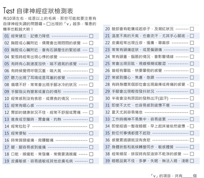 近年來,自律神經已成全球預防癌症檢測重點之一。現代人無論是否是上班族,經常感到倦怠疲勞、發熱、盜汗、頭痛、心悸、失眠、胸部有壓迫感、噁心、嘔吐、厭食、腹瀉、便秘.....等等,雖然感覺有一大堆的不適,可是到醫院檢查,卻都沒有發現異常的現象,這時臨床醫師多會診斷為「自律神經失調」。