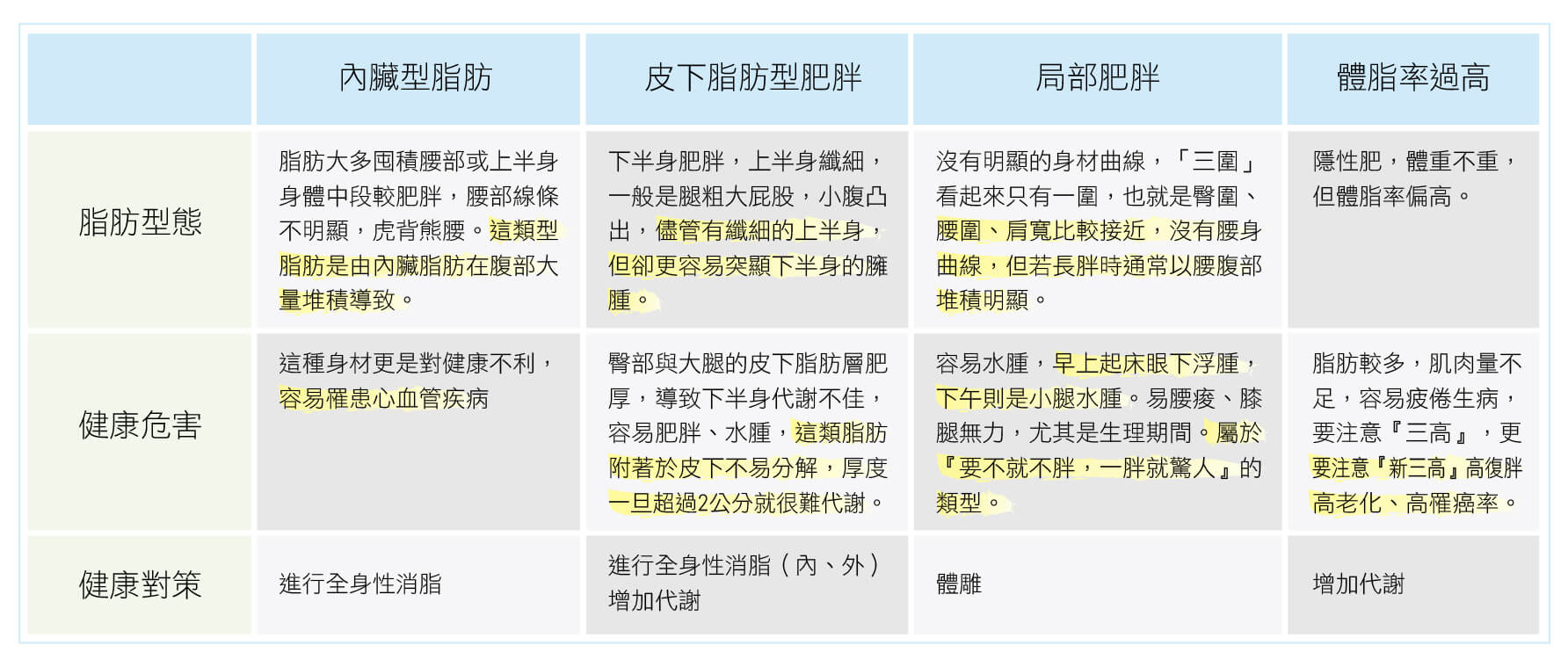 脂肪細胞主要可分成儲存能量的白色脂肪,和散發出熱能的褐色脂肪兩種,而白色脂肪又可分成分佈在皮膚下面的皮下脂肪,以及環繞在內臟四周的內臟脂 肪。不管哪種脂肪都具有保護及儲存能量的作用,並有維持身體體溫的平衡機制。