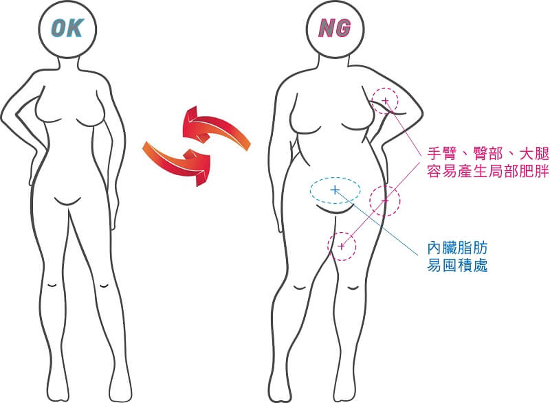 年輕女性較易囤積皮下脂肪,而內臟脂肪較容易出現在男性及停經後的女性體內。另外像是糖尿病、高血壓等,跟生活習慣有關的疾病形成,大都和內臟脂肪息息相關,內臟脂肪愈多,得到這些慢性疾病的機率就會愈高。內臟脂肪雖然容易囤積體內,但只要運動,還是會把它消耗掉,而皮下脂肪則否,雖說它不易形成,可是一旦囤積就比較不易消除。