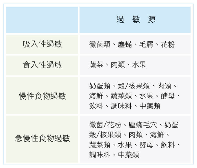 接觸到的塵蹣、黴菌、蟑螂、動物皮毛、花粉、海鮮、奶類、果仁、小麥、水果等40於種。對於吸入性或接觸性的過敏源,應避免之;對於急性過敏食物,終生不得嘗試食用。