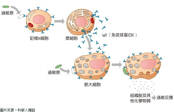 急性過敏反應的發生與先天體質及遺傳有關。外來過敏源經由吸入、接觸或食入方式進入人體,可啟動人體自然防禦機制,引起急性過敏症狀,包括頭痛、腹部絞痛、蕁麻疹等,甚至引發氣喘、呼吸困難、休克等症狀,若未能及時救治,嚴重患者可能死亡。急性過敏反應通常在接觸過敏源後數秒鐘至兩個小時內發生,因此從小自己會知道容易對哪些東西有過敏反應,應加以避免。