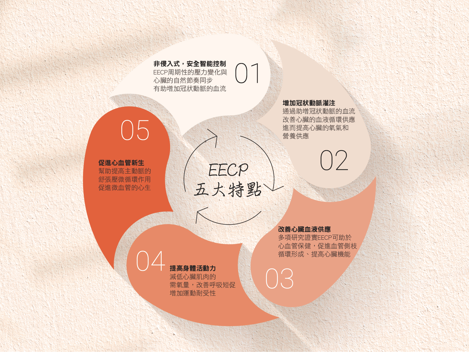 EECP是安全的治療方式,藉由電腦控制於包覆在人體下肢和臀部三段脈壓組成的加壓帶,配合心臟循環週期的舒張期,下肢的加壓帶會同步施以外部壓力,由小腿往大腿的循環治療,在這收放的過程讓心臟更容易運動,並促進血液循環。療程時間單次一小時,建議持續35次為一個療程循環,接受者只要輕鬆躺著即可完成,被動且靜態式的過程特別適合中高齡需求者或是心臟負荷度不適應者。EECP在醫學的運用就不僅僅侷限在心臟血管的領域,還廣泛應用在腦腎及其他器官的急慢性缺血性疾病,對接受者有很大的益處及輔助效果,並且為心血管保健提供了另一種舒適的選擇。