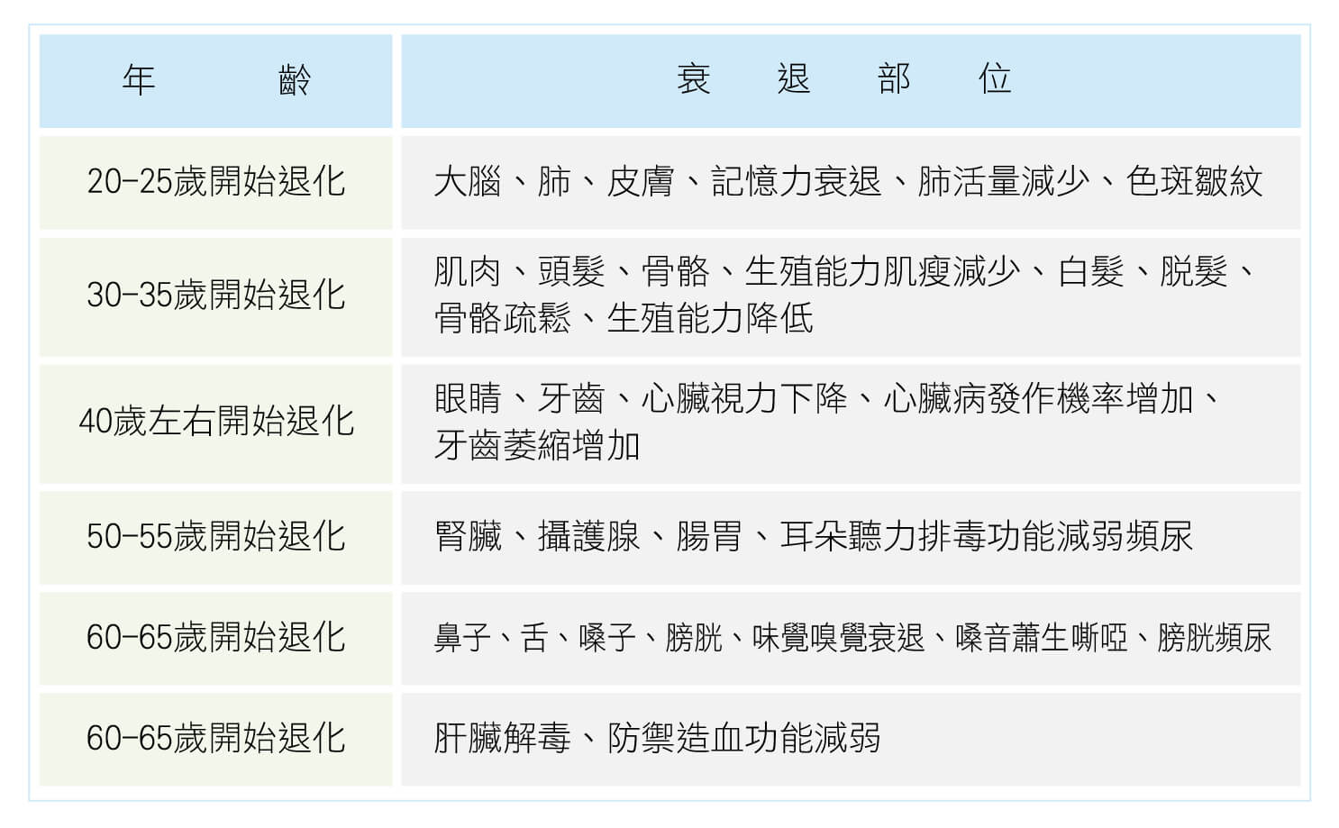 人類無論男女,到了30歲左右,人體的骨骼、肌肉、中樞神經系統、心臟血管系統都發育完成並達到最旺盛頂點階段,之後身體的各項機能就會逐漸的走下坡;特別是35~40歲左右就會明顯感受到體力衰退。而40歲之後,身體各器官機能開始產生變化,包括心理層面與生理層面影響。像是高血壓、高血脂、糖尿病、心血版疾病、骨質疏鬆、下背痛、肩頸、五十肩等等慢性病症狀的成人逐漸增加。