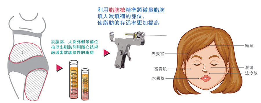 本院自體脂肪移植在手術前的臉型設計→手術中的健康的脂肪球篩選→術後的照顧,利用脂肪「塑」造立體豐滿臉型,掌握自然臉輪廓線條,運用脂肪做非常細微的調整,達到一張勻稱、圓滿立體的臉蛋,不再是像以往只能靠化妝彌補或遮蓋部分缺陷。在顯示這方面的細心度及手術的精緻度,不單單只是抽脂補脂而已。手術前、中、後都是很重要的關鍵,一般在於填補額頭、貴婦肌、雙頰、夫妻宮、法令紋等皆能得到相當高的滿意度,且存活下來的脂肪能達到穩定的存活狀態,時效性更勝於一般注射填充物填補。