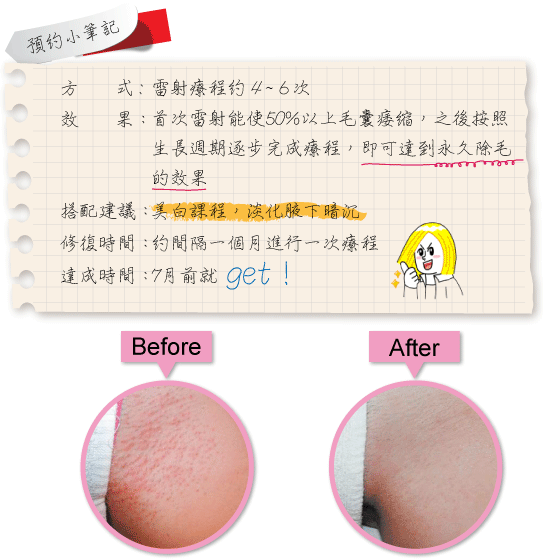 利用雷射施打在毛髮部位破壞毛囊細胞,使該根毛髮在未來無法持續生長,配合超大光點面積及特殊冰溫導光晶體,在舒適且不傷害皮膚之下快速且有效達到除毛功效,在這同時,治療後的毛孔因萎縮而變小,皮膚也將更光滑細緻。