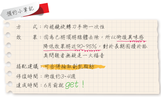 狐臭是一種體味,是因頂漿腺體分泌的體液經由細菌分解發酵,而形成異味。狐臭的根治方法為外科手術,手術方式是在左右腋下做小切口,使用內視鏡旋轉刀將頂漿腺徹底刮除,沒有復發問題,僅有極低的機率碰到尚有殘餘的腺體,但狐臭異味的程度已有非常大的改善。冬末春初正值氣候涼爽,是適合手術的時機,避免夏季氣候濕黏造成術後護理不便。