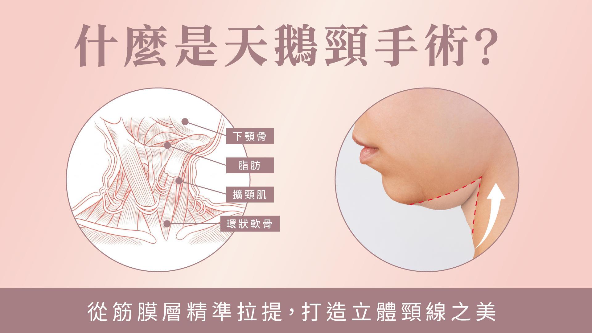 「天鵝頸手術」是一項專為改善「頸部鬆弛」與「下顎線模糊」所設計的內視鏡微創手術 。醫師透過隱痕微創切口,深入 SMAS 筋膜層,進行根本的結構性提升與脂肪調整,能同步達到頸線延伸、下顎緊緻、下巴立體的多重效果 。
