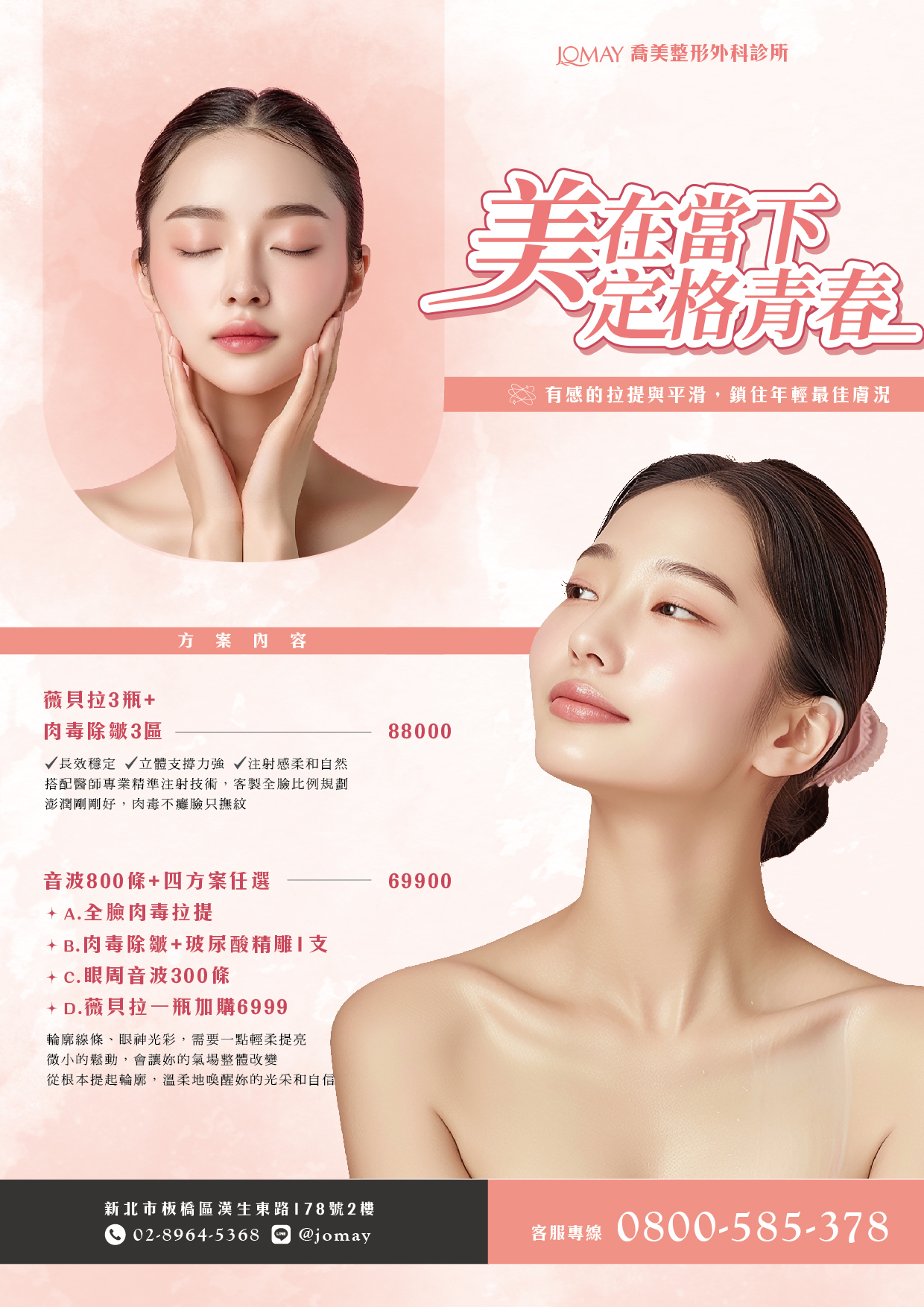 如果您現在有整形美容需求了,歡迎您到喬美博仕接受專業評估。 週一至週六AM09:00-PM18:00,手術諮詢請先來電預約。雷射、微整形歡迎多多利用線上LINE專人立即幫您安排預約。 諮詢專線:02-8964-5368 ,可多多利用 線上諮詢表單 來提出問題