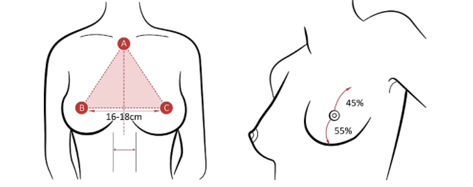 外觀:在美觀的觀點認為半球形與圓錐形的胸型是屬於外形較理想的胸型。兩乳頭間距在16-18公分之間,乳房微微向上挺。上半部佔乳房比例45%且呈現自然的坡度。