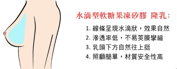 越來越多女性藉由整形讓自己變得更美,想擁有完美黃金比例的胸型,讓cup步步升級、最快速的方法就是尋求醫美改造!根據調查超過半數以上的男女公認像『志玲姐姐』那樣的水滴型傲人雙峰,是令男人心動,女人稱羨不已的『夢幻美胸No.1』。以往比較常見的隆乳方式以果凍矽膠或鹽水袋植入,這類的胸型呈現圓盤型,叫飽滿圓渾,必須搭配術後按摩來降低夾膜攣縮率;而衛福部在今年九月正式通過的新式水滴型軟糖果凍矽膠,不易破裂、莢膜攣縮率低、外觀宛如水滴般的線條,可雕塑出最接近自然的胸型,視覺接受度也大大提升!