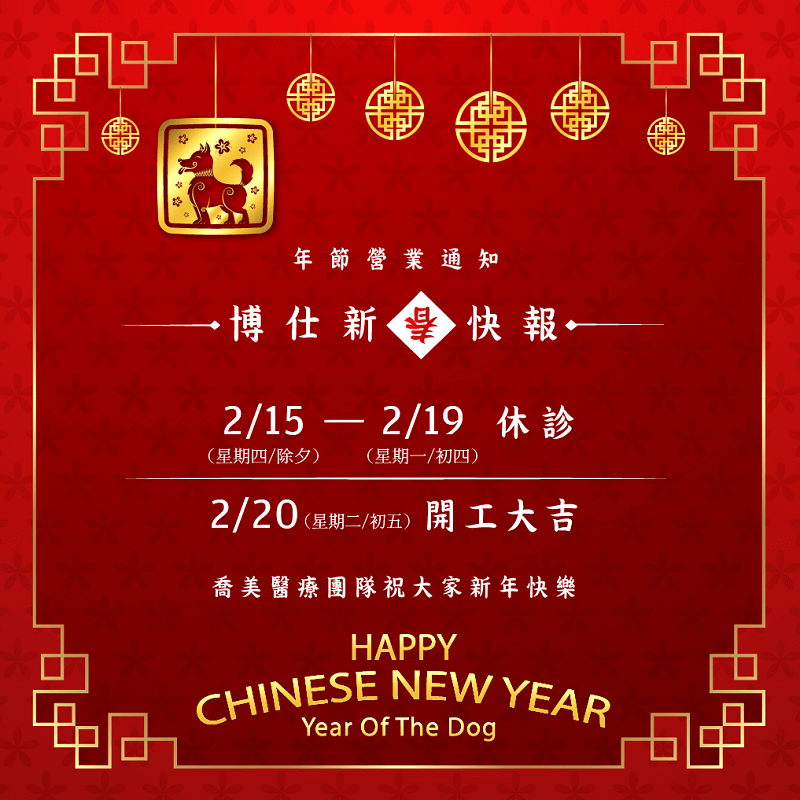 新春旺旺,好運美麗都來!喜氣的新年來囉!『人生是道風景;快樂是種心境,願幸福快樂時時刻刻陪著您 ❤』今年狗年大吉,美人們要怎麼利用這年節假期呢?新技術講求「非侵入式療程」,如何選擇專屬妳的醫美療程?喬美醫療團隊『客製妳的容顏』療程,增添美麗風采,讓您一年比一年更年輕有自信!