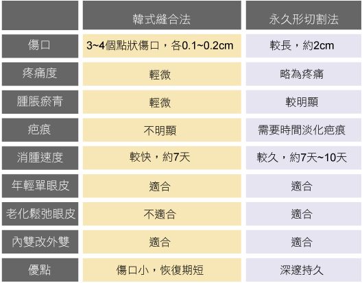 年輕、眼皮緊實、上眼皮脂肪少者的人可使用韓式縫合法製造雙眼皮皺摺。以3至4個點狀傷口將現埋入真皮下方式,形成眼皮自然打折線條。好處是傷口小、恢復時間短、手術痕跡自然不明顯。若是泡泡眼、三角眼等問題者,需藉助切割法雙眼皮手術,調整過度增生的眼皮與脂肪組織,針對先天眼型問題徹底矯正,打造自然媚力眼型。