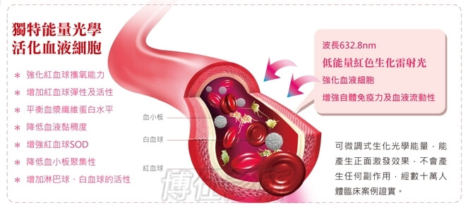 靜脈日光雷射是利用低能量氦氖雷射紅光進入人體血液照射,對血球細胞粒線體進行光化學作用,光能量會轉成生物能量,使紅血球的攜氧能力增加,進而改善自體血液循環,新陳代謝會增強,白血球及其他免疫相關的機能也會變好,不論是作為輔助治療、正規醫療或保健抗衰老的預防醫學來說都有很好的效果,因為自體免疫機能平衡了,人自然就能保持在健康最佳狀態。