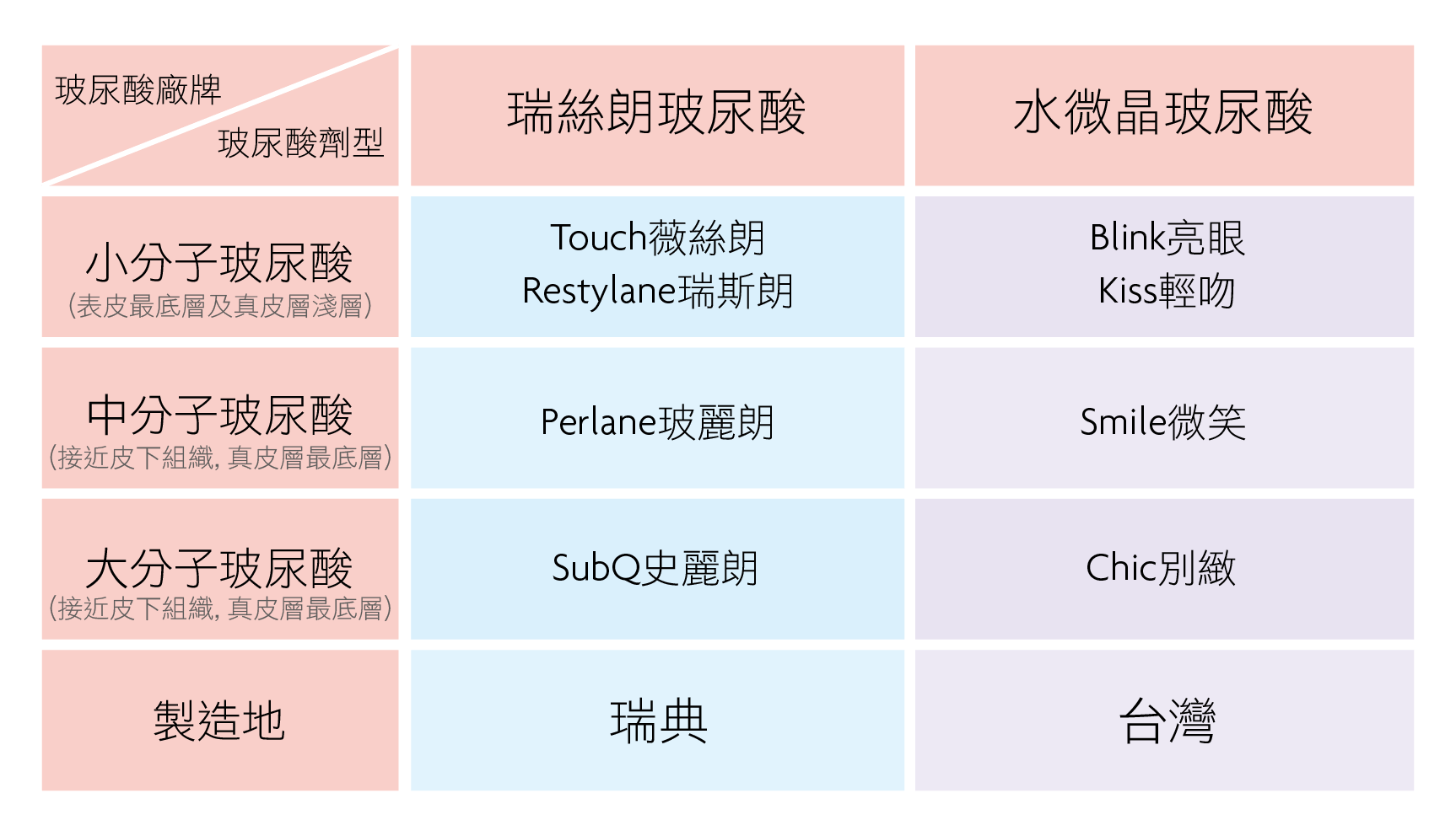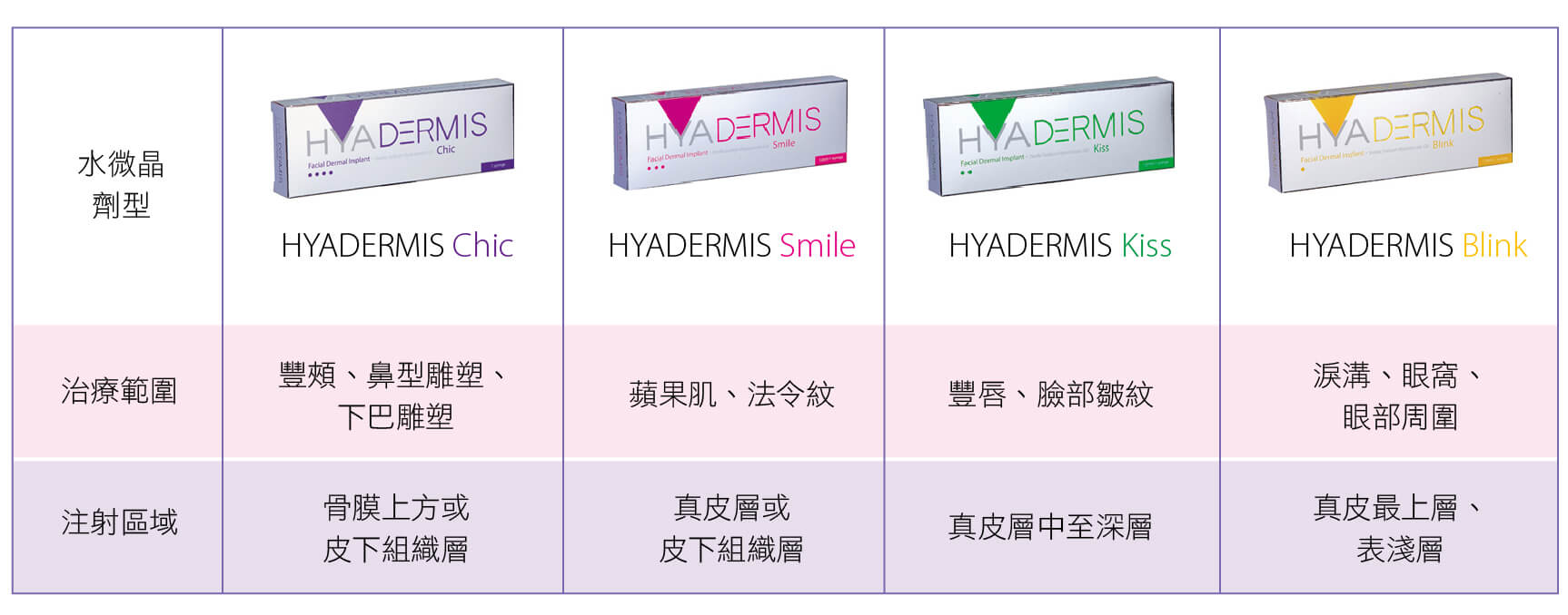 二. 水微晶玻尿酸:衛生署許可由台灣生產,屬於交聯式玻尿酸強化顆粒達到良好的支撐效果,依產品分子由大到小依序分為:Chic、Smile、Kiss、Blink。依造臉部不同範圍挑選合適的劑型與考量自身期望值。