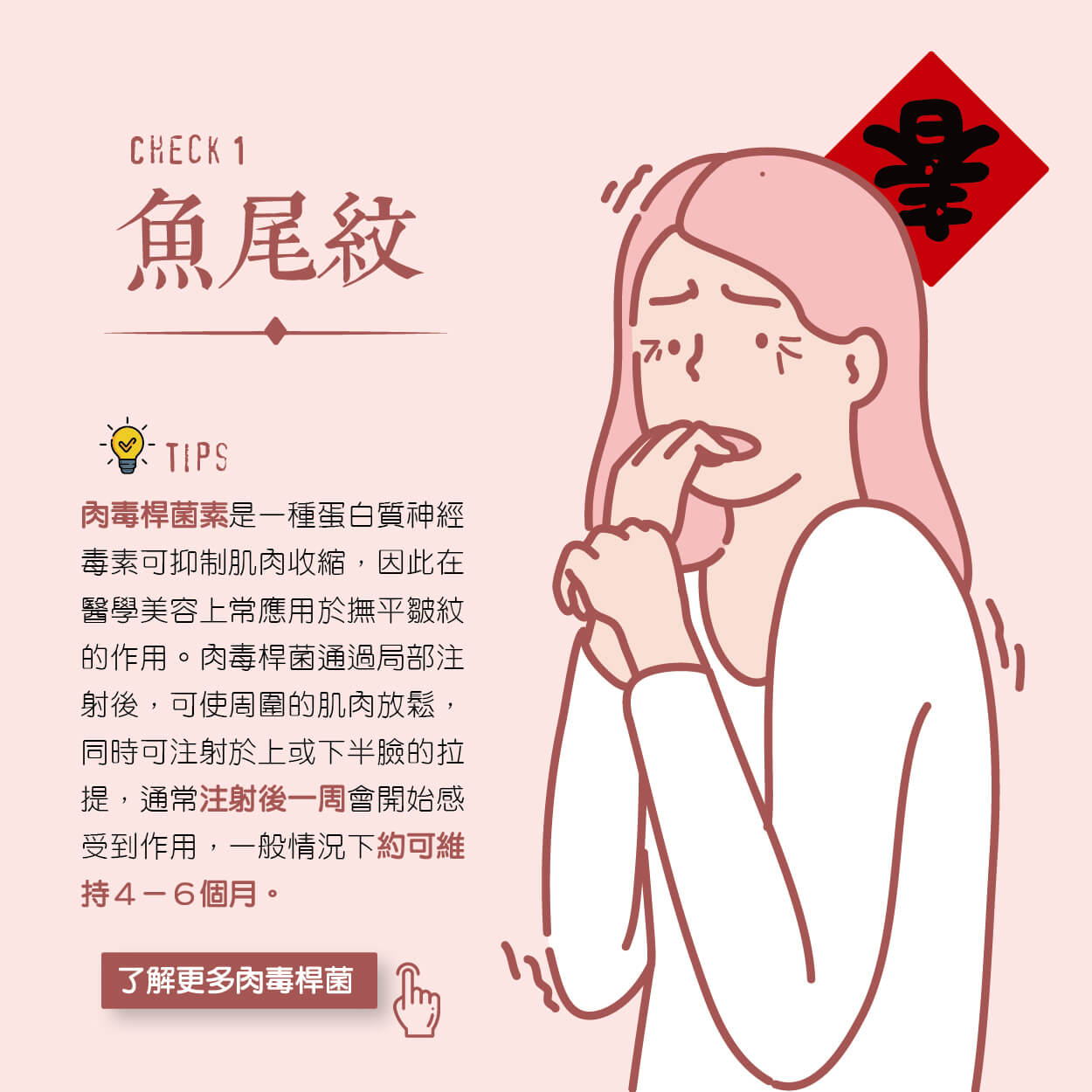 皺紋的形成有些是天生,但大多是由於膠原蛋白隨著年紀逐漸減少、斷裂,導致皮膚失去彈性,而眼周肌膚又是最為脆弱的肌膚部位,會因為後天的日曬、乾燥、表情或是吸菸等影響,導致細紋加速形成,看起來年紀也就比一般年齡還要大,而面相常說眼尾要平滑光亮,代表和情人感情好,若魚尾紋路多,在情感生活易波折不易。